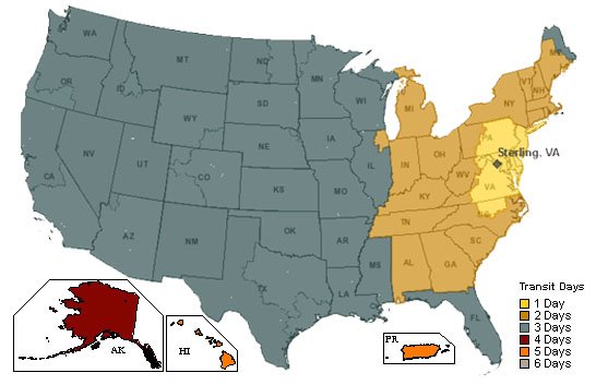 Example: A NY State order falls in the zone of 2 transit days. If you order by Monday 3:30 pm eastern time, you would receive your order on Wednesday. An order going to northern CA would receive a free 3 day upgrade and take 3 business days, so an order placed by 3:30 pm eastern time on Monday would arrive Thursday.